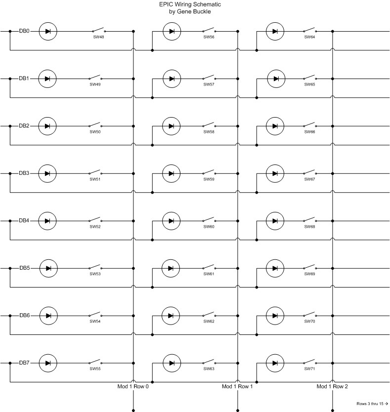 The EPIC uses an input method that is very similar to how your keyboard is scanned. EPIC uses an 8x32 matrix for the main input Modules. This gives up to 255 switch inputs. Each input is diode isolated so an individual switch state can be correctly detected. You can view a schematic here that illustrates how the input matrix is wired. Along the left of the schematic are the 8 "data bit" rows and along the bottom are the 32 "module" rows. Modules 1 and 2 each contain 16 rows and is accessed via the 40 pin header on the Expansion Module. Module 0 is accessed via the DB15 connectors on the Expansion Module. Module 0 supplies 48 switches, giving the EPIC-wide total of 304 inputs.